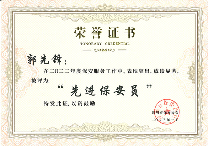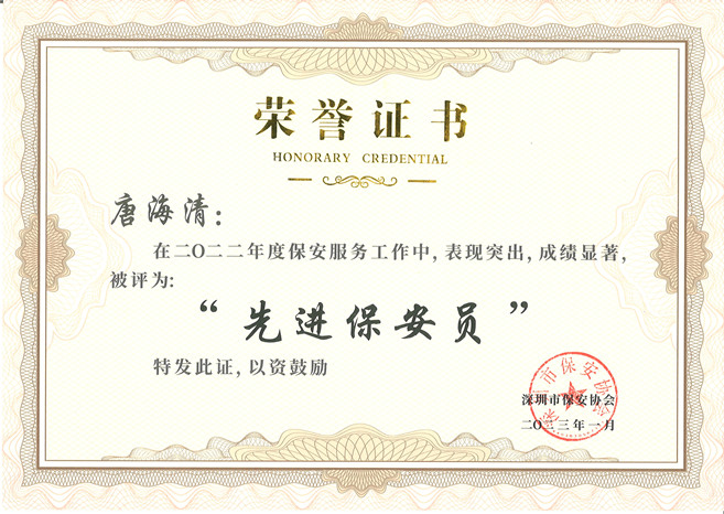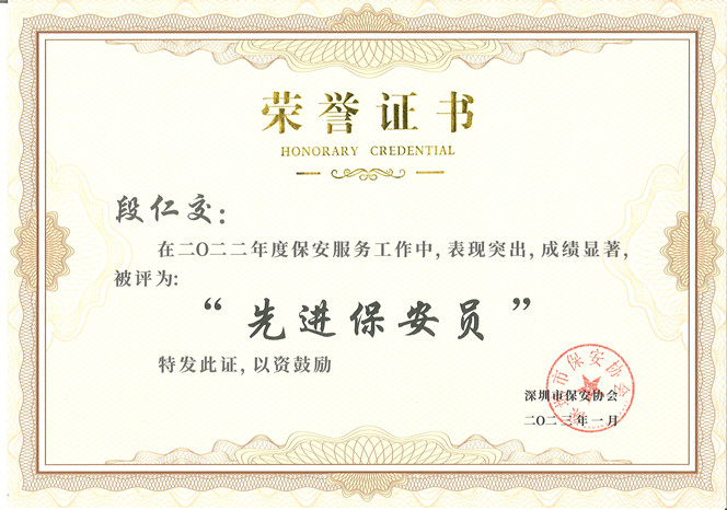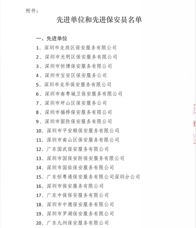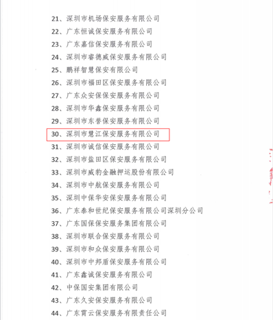 深圳市慧江保安服务有限公司,在深圳市保安协会2022年度评优评先工作中荣获“保安服务先进单位”,段仁交、唐海清、郭先锋3名同志荣获“2022年度先进保安员”。自2021年,保安行业协会开展“评优评先”活动以来,深圳市慧江保安服务有限公司已经连续两年荣获“保安服务先进单位”。