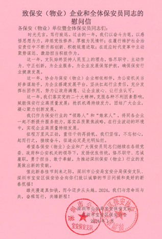 慰问小组分赴各驻点项目,亲切慰问坚守在一线岗位上的保安员,并向大家送上慰问礼品和新年问候,将一份份慰问品发放至各项目执勤的保安员手中,并代表公司送上诚挚的关怀和问候,感谢大家不分昼夜坚守岗位为公司发展所做出的贡献,同时嘱咐他们牢固树立安全意识,认真做好本职工作,加强春节期间巡逻检查力度和安全隐患排查,圆满完成春节期间各项安保任务。保安员纷纷感谢公司的关怀,表示一定坚守岗位,不负嘱托,确保春节期间安全无事故,以实际行动为公司2024年的发展贡献自己的力量。
