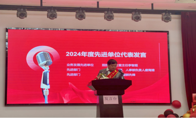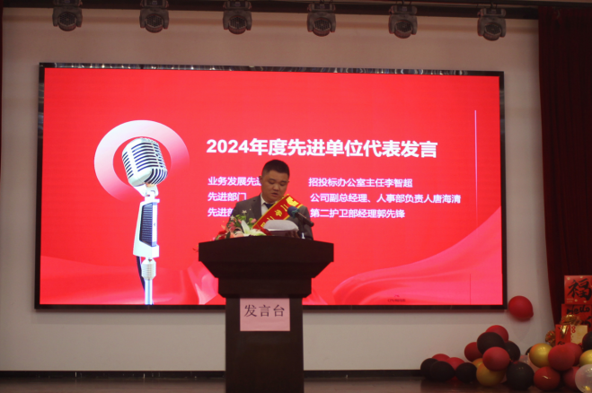 在庄严的国歌声中,大会正式拉开序幕。会上,副总经理唐海清受段总委托作公司2024年工作总结报告,并对2025年的工作目标以及计划进行了部署。