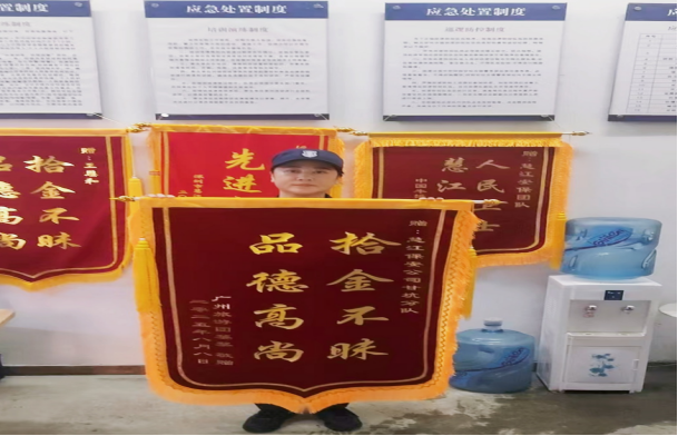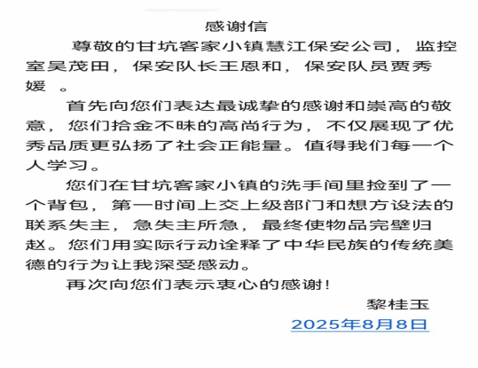 近日,深圳市龙岗区甘坑古镇旅游景区发生了暖心一幕,市民黎女士将一面印有“拾金不昧 品德高尚”的锦旗和一封感谢信送到保安员贾秀媛手中,感谢贾秀媛拾金不昧的高尚行为,为其寻回丢失的背包和财物。